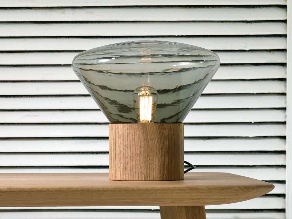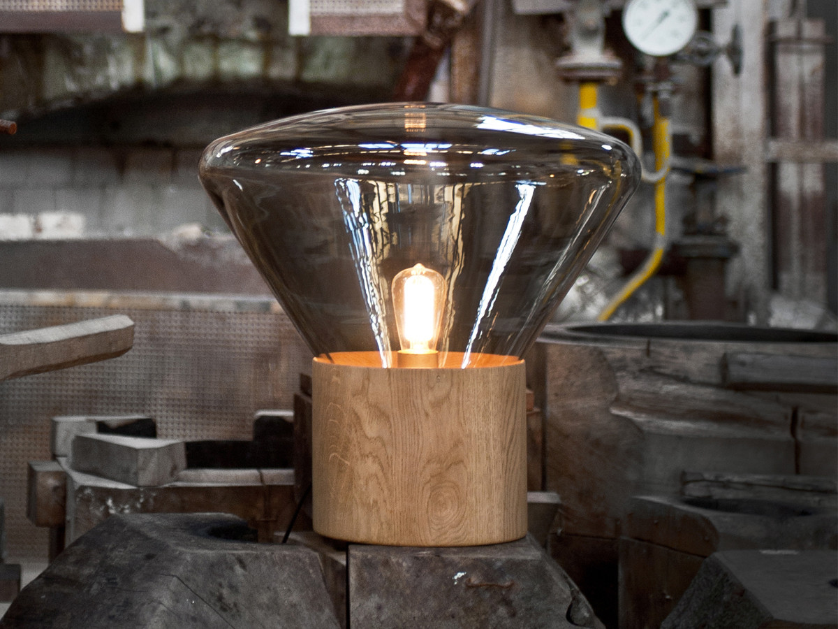 The Brokis Muffins Table Lamp features puffy, round shapes which combine traditional hand-blown tinted glass with oak or walnut to give a gentle light that fills any space with a special aura.