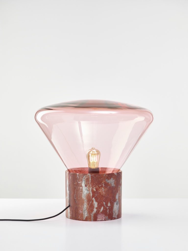 Lamp body in wenge wood, grigio talami marble, rosso francia marble, rosewood. Handmade glass shade. Textile electrical cord.