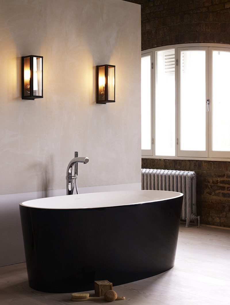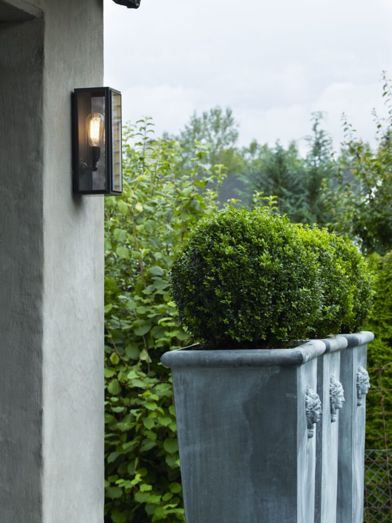 A Narrow Box Wall Light, skillfully handmade in brass, with an antique finish. Glass panels fitted inside the box frame on three sides. Removable pins at each side to allow access. IP44 rated, this wall light is perfect for adding a contemporary edge to both bathrooms and exteriors.