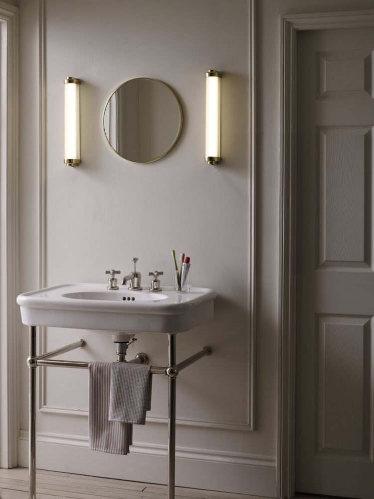 This is the LED version of the 7211 Narrow Pillar Wall Light, with an integral dimmable driver. The light’s curved Art Deco-inspired profile is made of 8mm diameter solid glass rods. Available in weathered brass, polished brass or chrome plated finishes and in two different sizes.