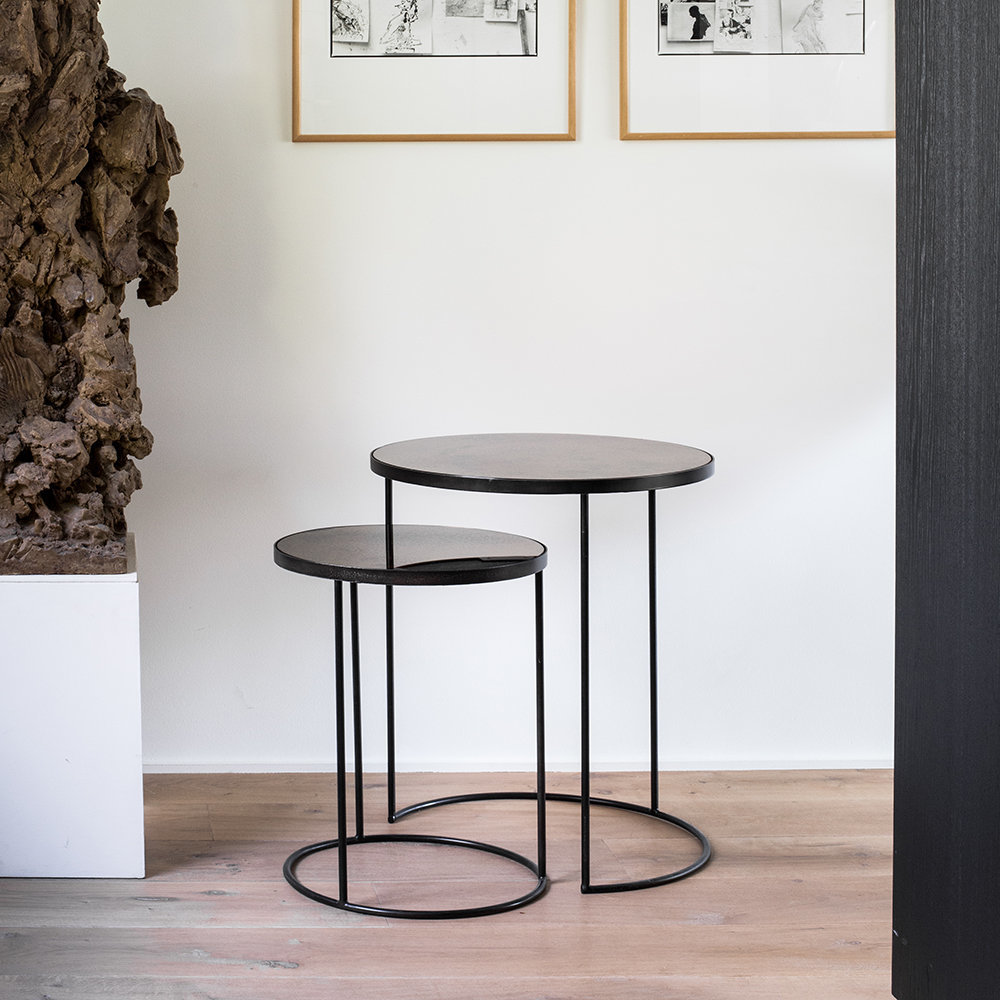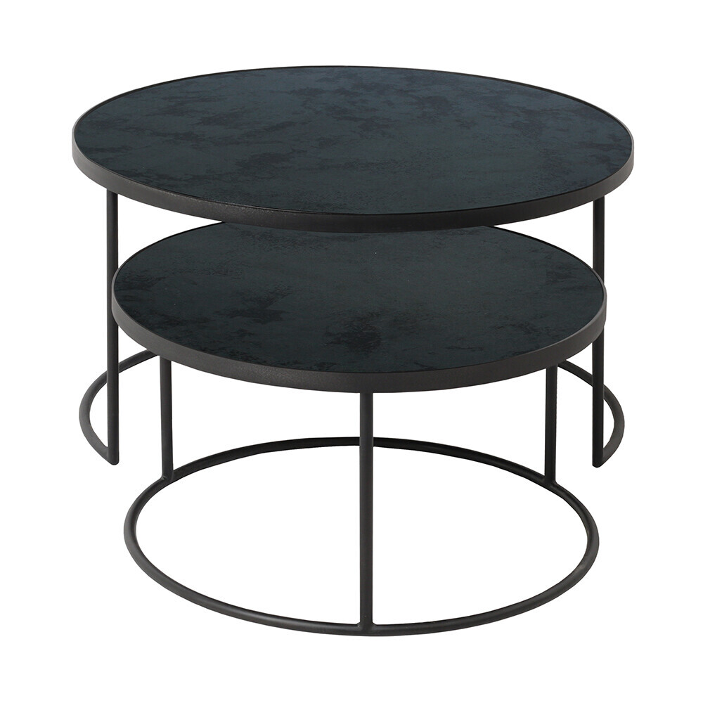 This nesting coffee table set captures the beauty of your environment on its reflective surface. The heavy aged mirrors ooze vintage vibes, while its metal frame brings you right back to modern times.