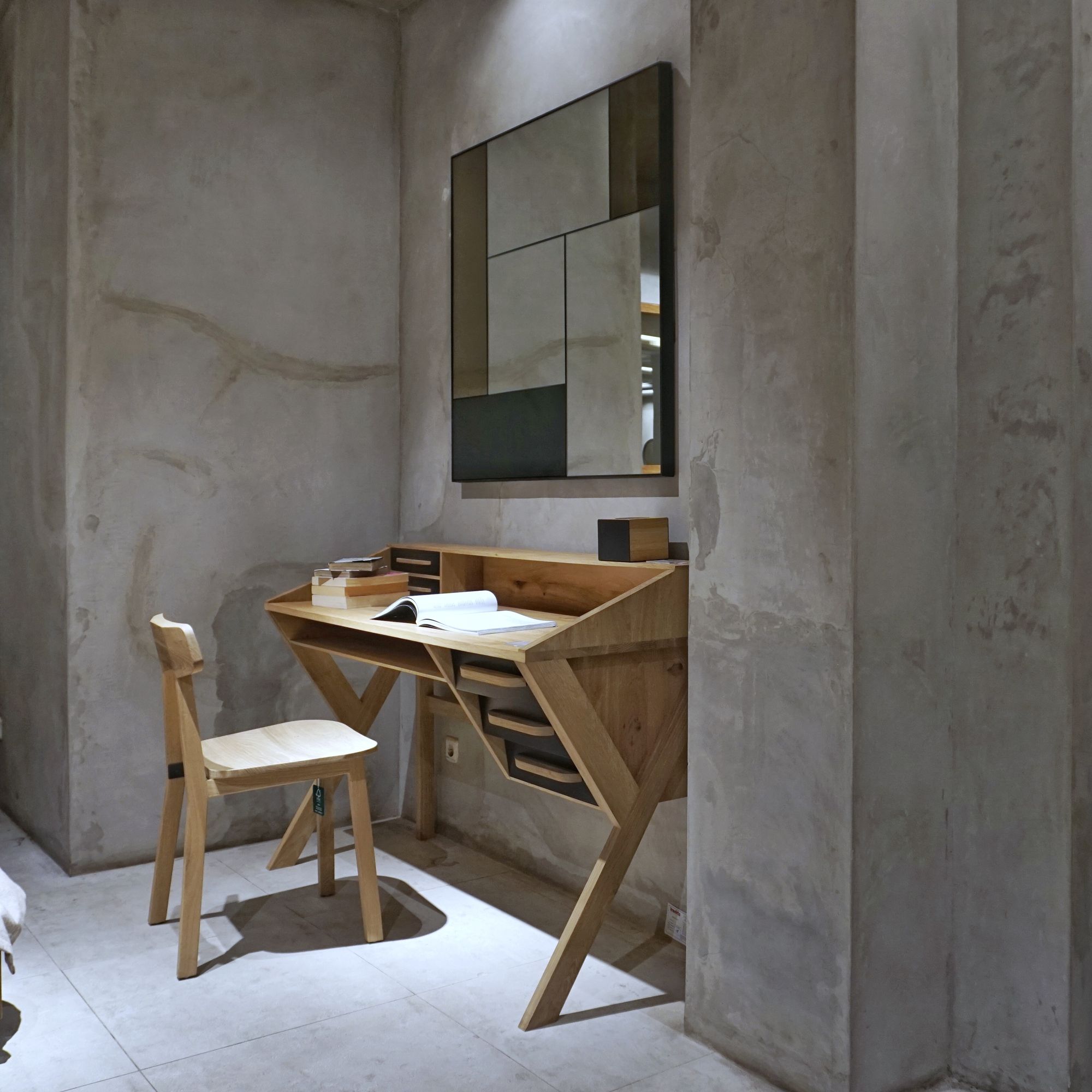A blast from the past, the origami-inspired desk adds just the right amount of 60s retro touch to an office space. Made from solid oak, this desk is available in three different colours.