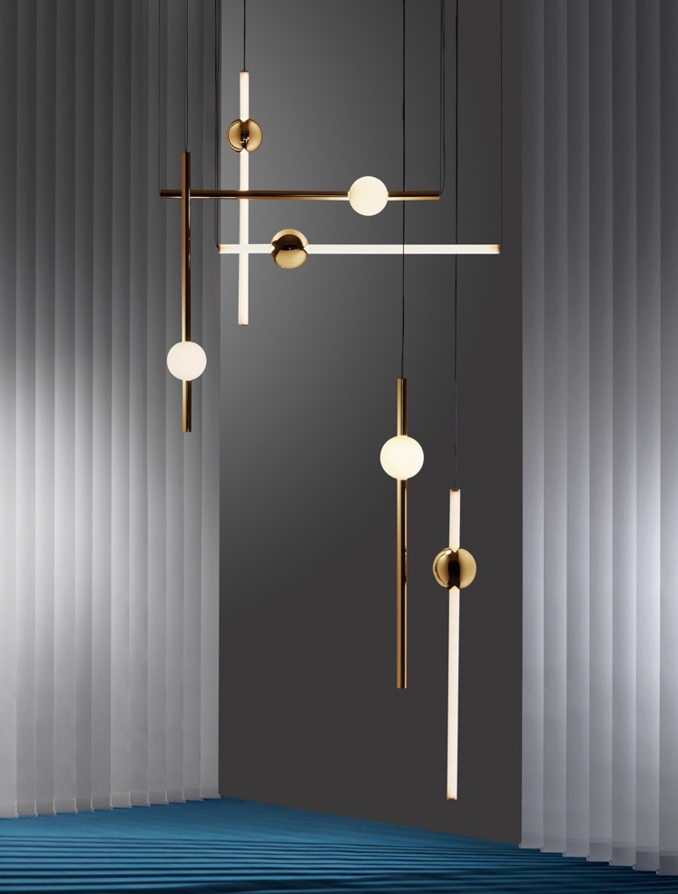 Orion comprises simple modular lights with opposing opaque and solid polished gold spheres along with opaque and solid polished gold tubes. These connect and expand horizontally and vertically to create bespoke constellations of light with infinite adaptations.