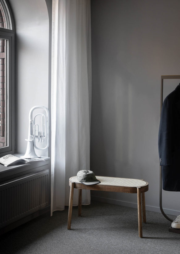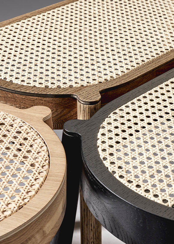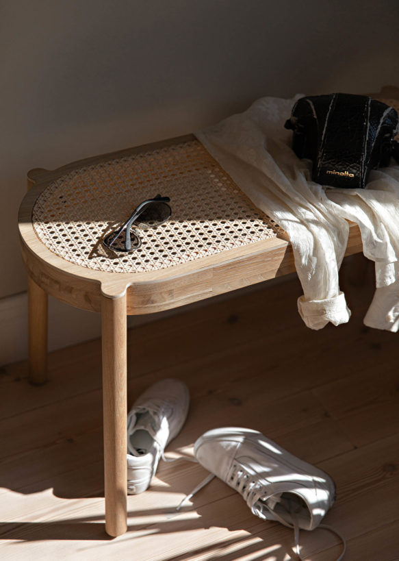 The Pal bench is crafted in solid oak and fitted with a soft and comfortable wicker seat. The wicker seat is woven from natural reed fibres and integrated into the frame to sit level with the surface. The supporting frame is available in light oiled oak, black painted oak and smoked oak, just like for its other stool pal.