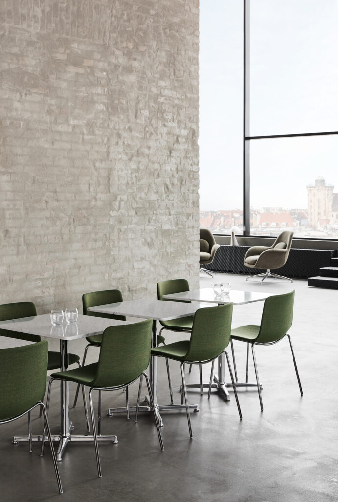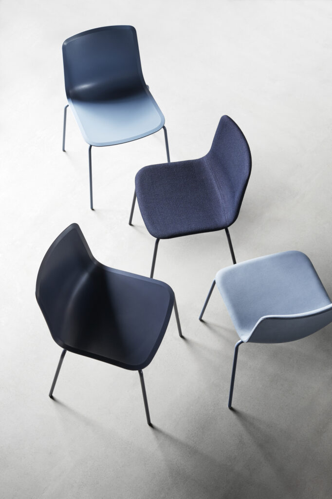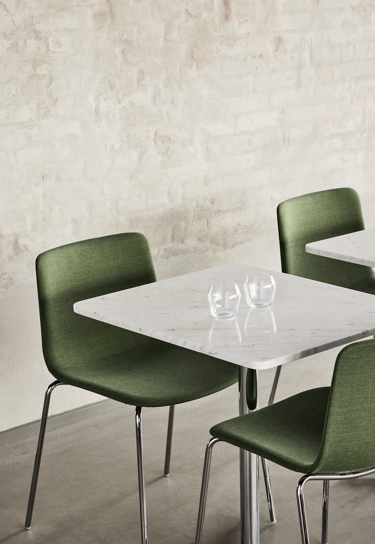 Pato is a versatile chair concept based on a shell in 100% recycled polypropylene, which is also available with seat upholstery or fully upholstered, and with a wide range of bases. This version with a four-leg tube base is stackable and certified with the EU eco-label. Keeping material flows as clean and recyclable as possible, the Pato components are kept homogeneous to a degree where they can be recycled in the future as needed.