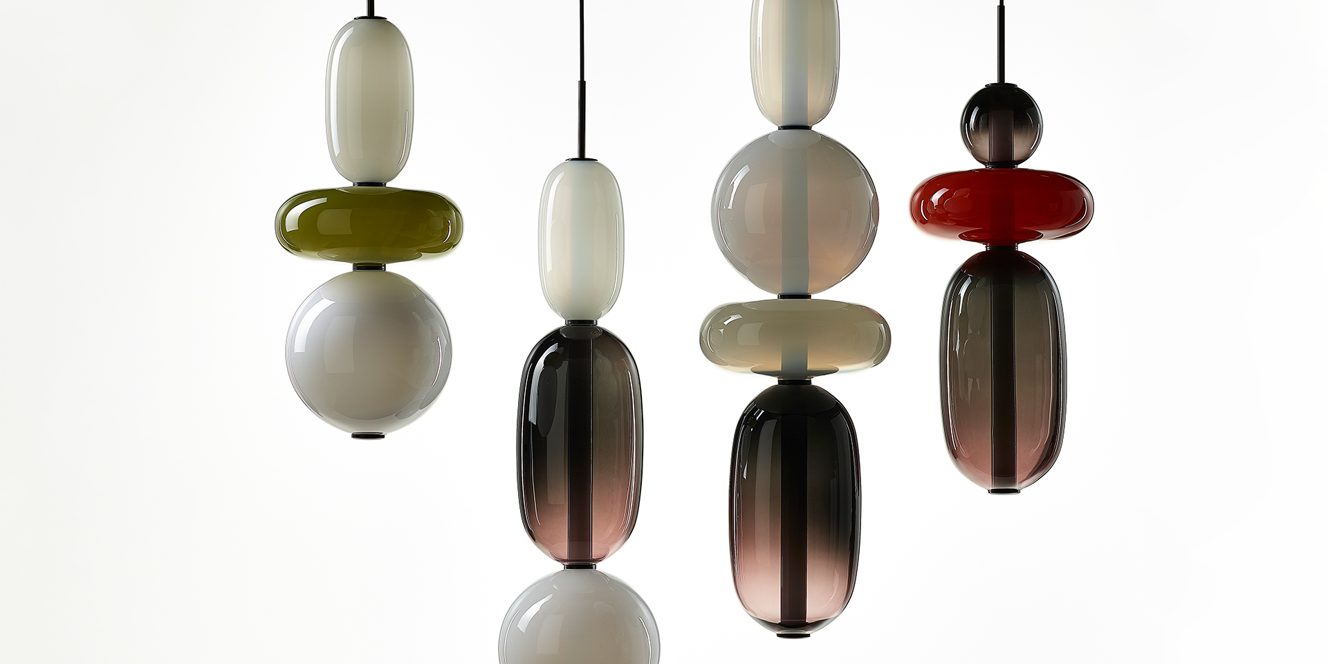 Smooth pebbles from summer beach, or as a reminder of someone special. Their diverse shapes and colors inspired this collection that lets you to create distinctive combinations. String the hand-blow glass elements just like colorful beads, connected by their interior light source.