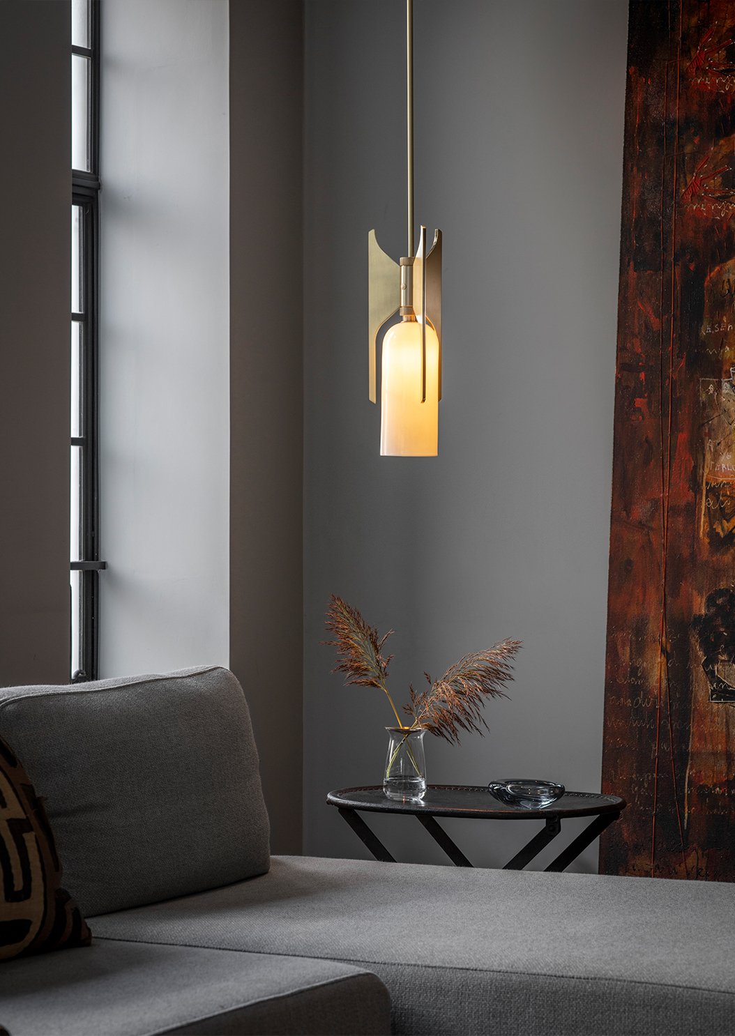 Three solid brass fins protect a fine bone china diffuser, with a brass rod providing ceiling support. Works well over a kitchen island or over a side table illuminating a cosy corner.