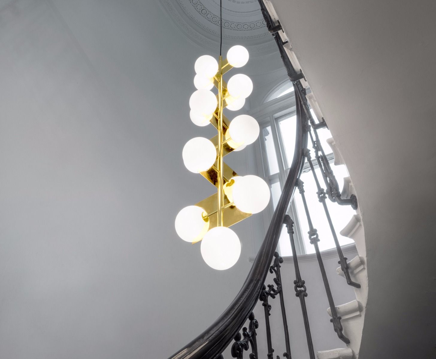A brass-plated statement drop chandelier comprising of 4 double-layered white glass spheres distributed seven rotating planes. This space-filling chandelier creates a dramatic feature in any staircase, lobby, atriums or high-ceilinged environments.