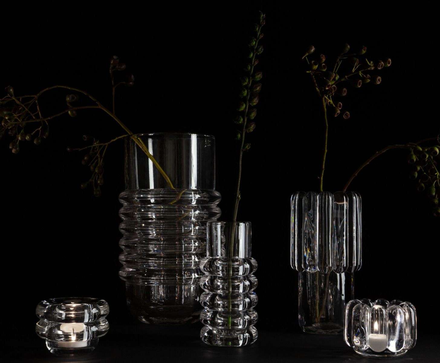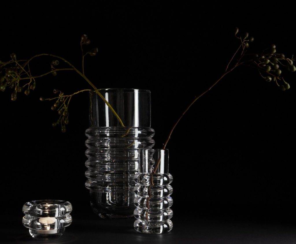 Press is a stem vase designed and engineered to catch and refract light, and to last for ever. This heavyweight grooved vase is made of fat, chunky coils of pure and clear transparent glass. Bold in silhouette and simple in function, it is manufactured by dropping big globs of molten glass at 1,200 degrees centigrade and pressed in two or three part iron moulds to create the immediately familiar silhouette.