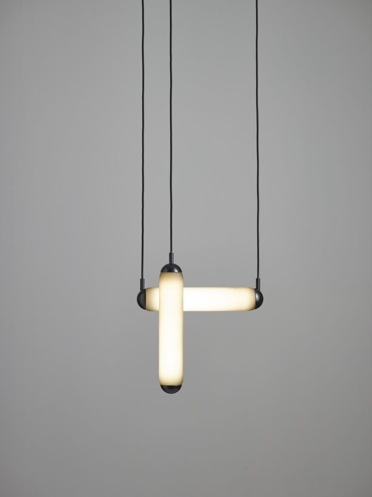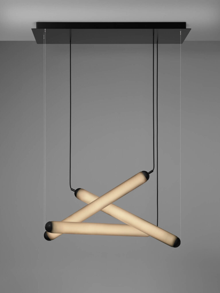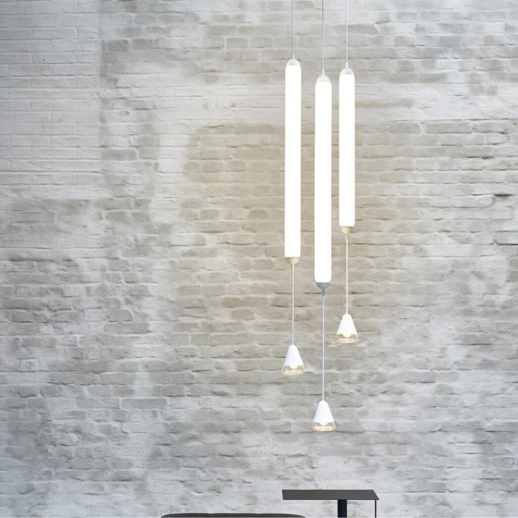 Puro is a boldly minimalistic variation on atmospheric pendant lights. Inspiration for the collection and its name come from the Spanish word for “cigar”, which also means “puro” and is a reference to the composition’s clean lines. The design creates an intriguing interplay between horizontal and vertical luminous cigar tubes levitating in space above simple bell lights. The diffused glow of the tubes combines with that of the bells to elicit a dynamic ambience, while the alternating gloss and matte finishes provide a degree of provocation.