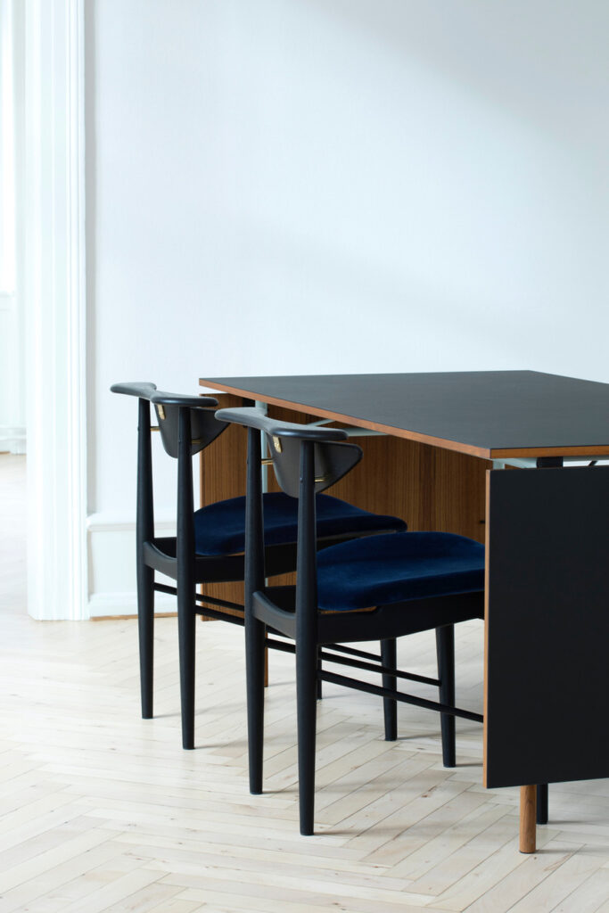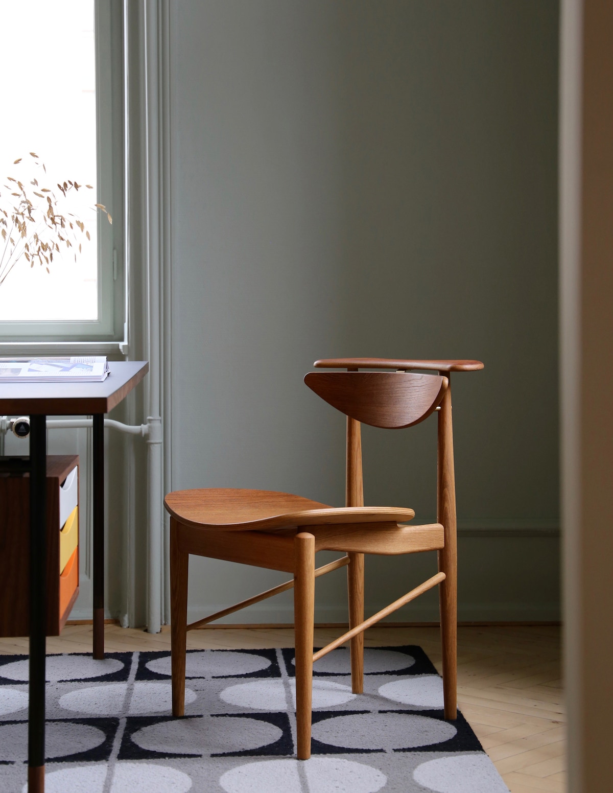 Finn Juhl designed the Reading Chair as both a dining room chair and as a reading chair. It is designed to be equally comfortable whether you choose to sit facing the front or the back. This might sound both odd and complicated, but thanks to Finn Juhl’s genius, the result was a simple, unpretentious, yet thoroughly well-designed and visually pleasing chair. The Reading Chair is manufactured in oak with a backrest and top piece in walnut. The chair is also available in a fully black painted variant. The seat is upholstered with either fabric or leather. The Reading chair is now also available with a veneered walnut seat.