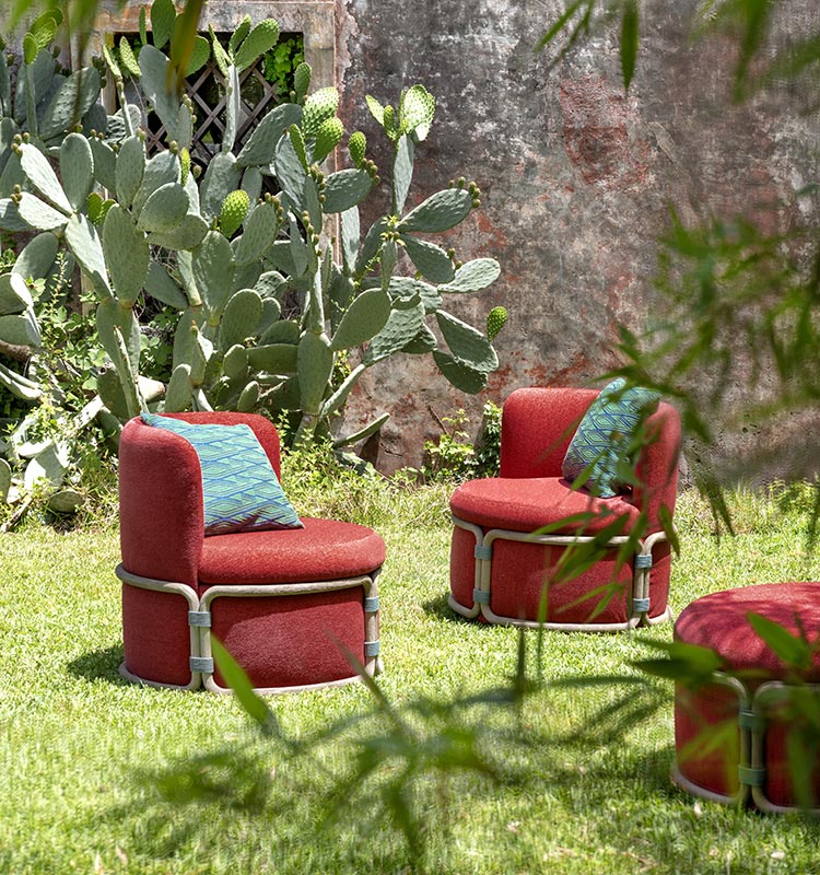 Rotin is a lounge collection where shape, colour and substance come together to tell the story of a new way of thinking and en-joying places for relaxing in company in the open air. Comprising sofa, lounge armchair, coffee table and pouf with structure in pickled teak, Rotin is inspired by Asian tradition, which sees bamboo as the main element for outdoor furnishings together with techniques normally used in the production of rattan furniture.