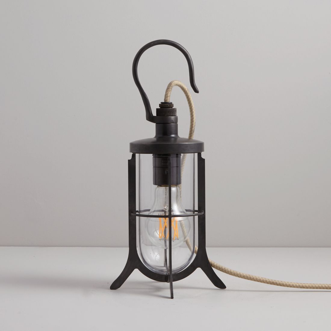 The Ship’s Hook Light was designed as a portable hand-held task light. Originally fitted with a long rubber cable for easy transportation and a hook for hanging on ship’s decks or stable doors. Today, the rubber has been changed to our signature cotton braided cable, adding a new twist to the classic design. Available in polished or weathered brass and a choice of frosted or clear glass.