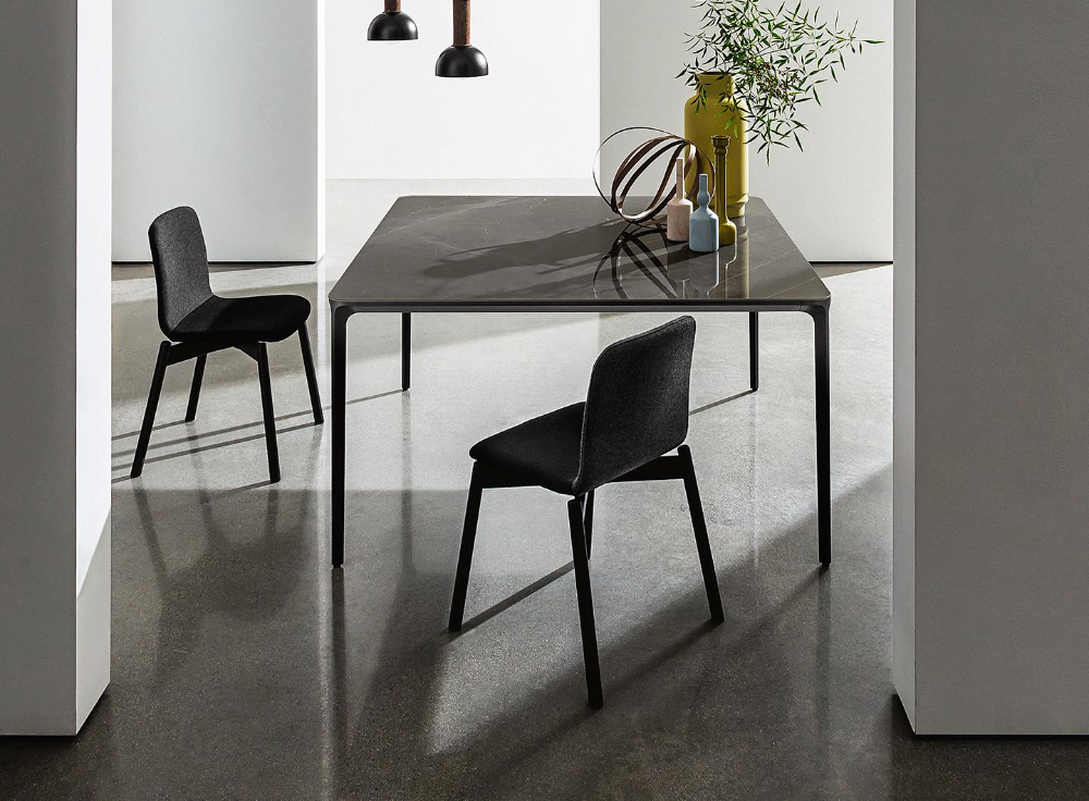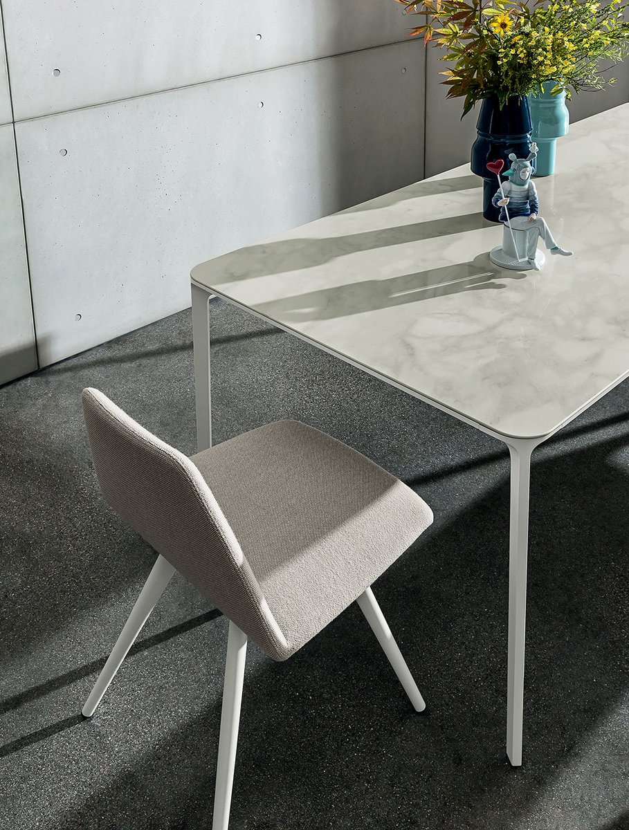 Dining table with die-cast aluminium legs, polished chrome finish or lacquered, various finishes, and anodized or lacquered, various finishes, aluminium structure profile. Tempered glass top, 8 mm th. lacquered or frosted lacquered, various colours. Top available also in MATERIA, ceramic, wood, or HPL, various finishes.