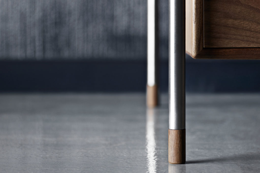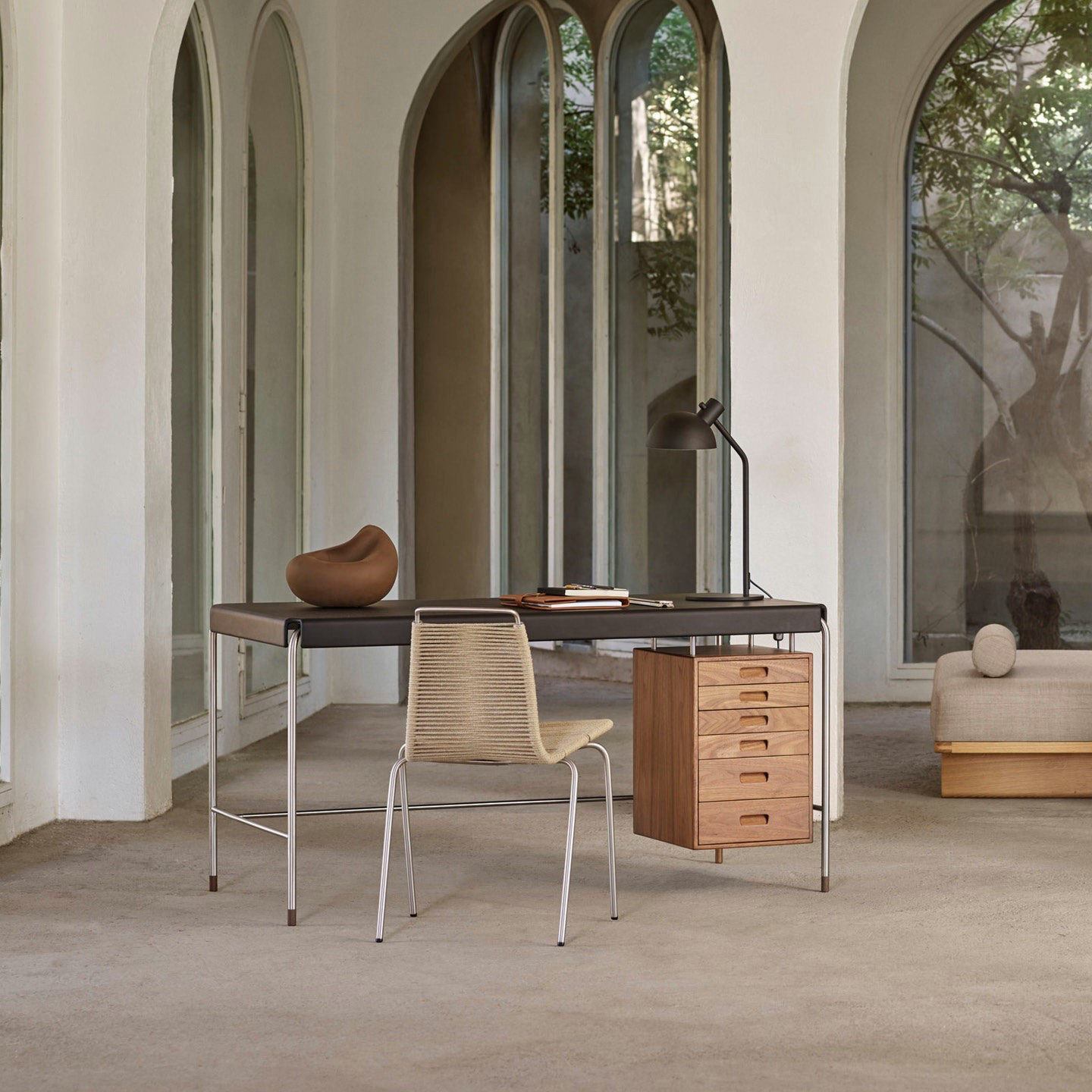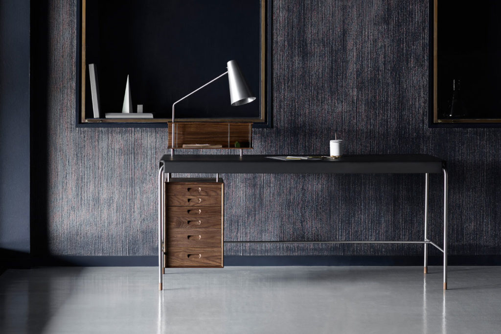 A conical desk lamp in brushed stainless steel is a seamless extension of the design, as is the glass-fronted, wood-and-veneer letter compartment. Beneath the table, a six-drawer unit, also in wood and veneer, is suspended from fine metal tubes – a feature that, together with the slim frame and solid-wood feet, contributes to the desk’s air of lightness.