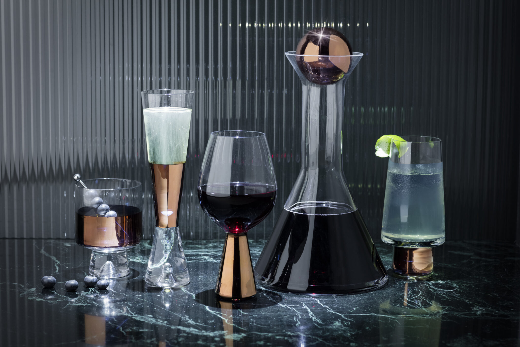 A pair of mouth-blown low ball glasses presented in gift-worthy packaging. Handmade in Poland, the set of cocktail glasses have a modern faded black finish, setting a mysterious and indulgent tone. This pair of Tank glasses take their sculptural cue from the functional shapes and volumes of scientific glassware. Featuring a hot-cut edge and an etched Tom Dixon logo.