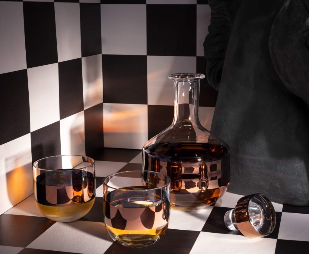 Set includes a Tank Decanter and pair of Tank Wine Glasses. Made in Poland, this decanter and pair of glasses are ornamented with hand-painted copper detailing. This Tank Wine Set takes its sculptural cue from the functional shapes and volumes of scientific glassware. Featuring a hot-cut edge and an etched Tom Dixon logo.