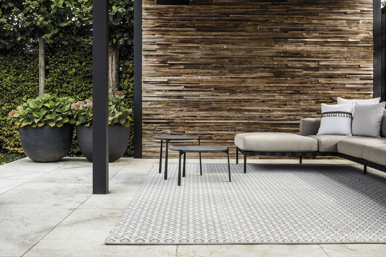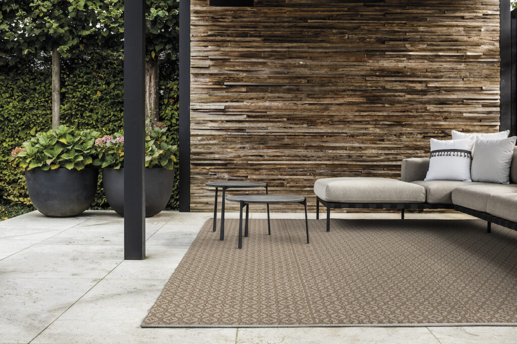 Terrazza, the latest addition to the outdoor collection, consists of woven strips of 70 cm stitched together by hand to obtain an elegant rhythmic motif.