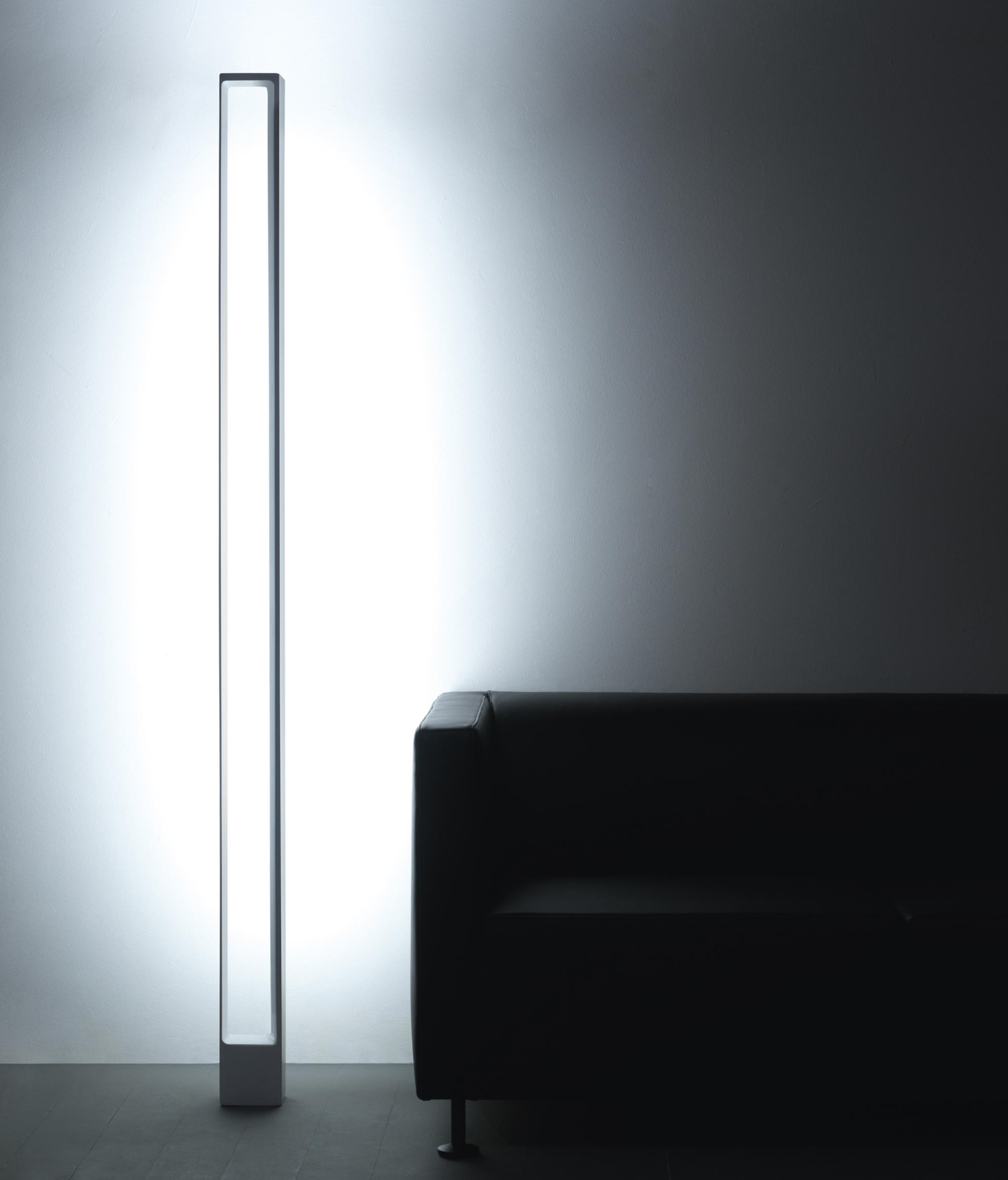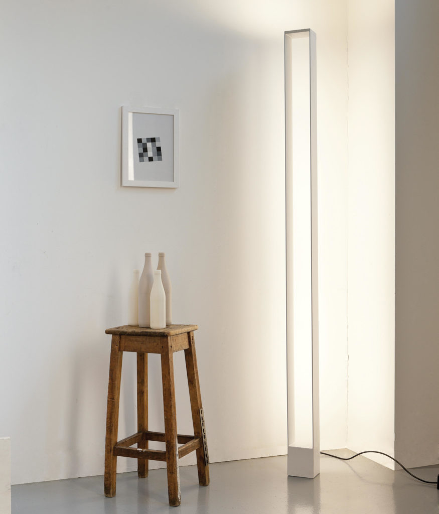 Floor lamp with body in extruded aluminium, heads and base in die-casted aluminium, diffusers in opal and transparent metacrylate. Structure painted in matt white, matt black, titan grey or semigloss gold . The uplight LED source provides an uplight warm and diffused flood, while the back LED creates an indirect ambient lighting. Double dimmable.