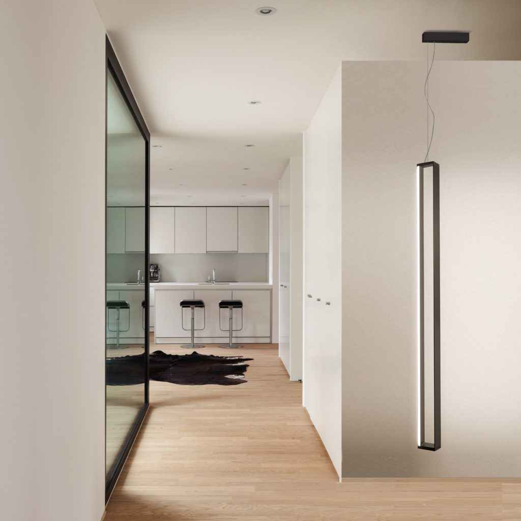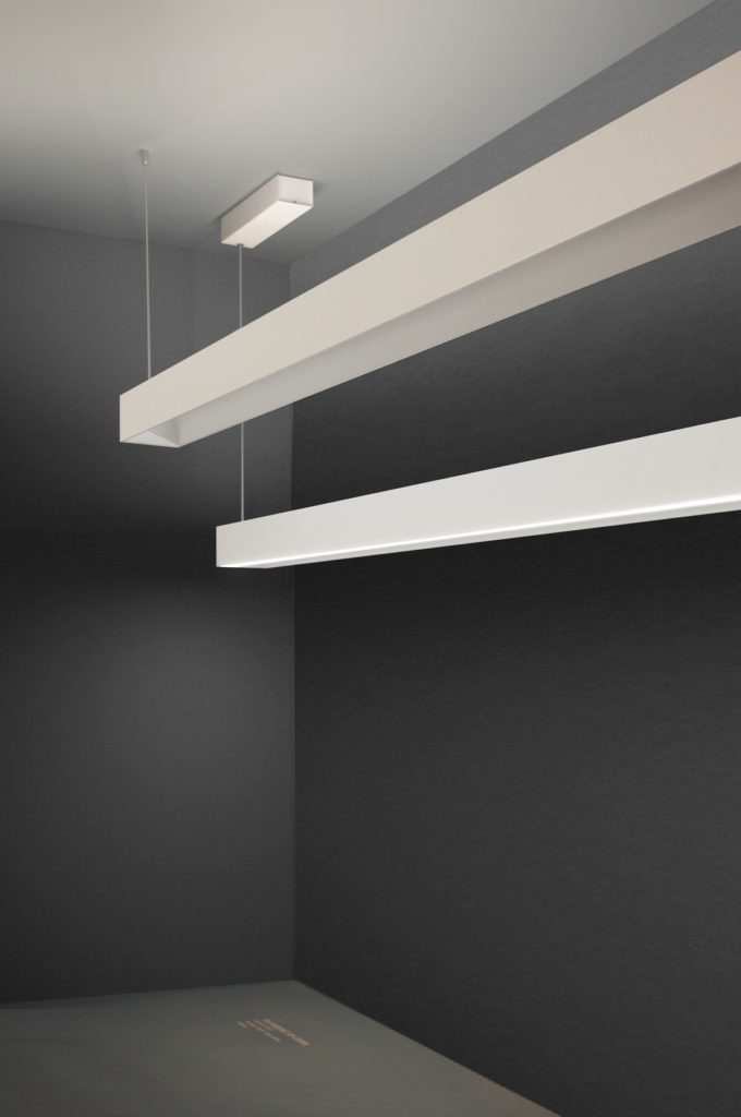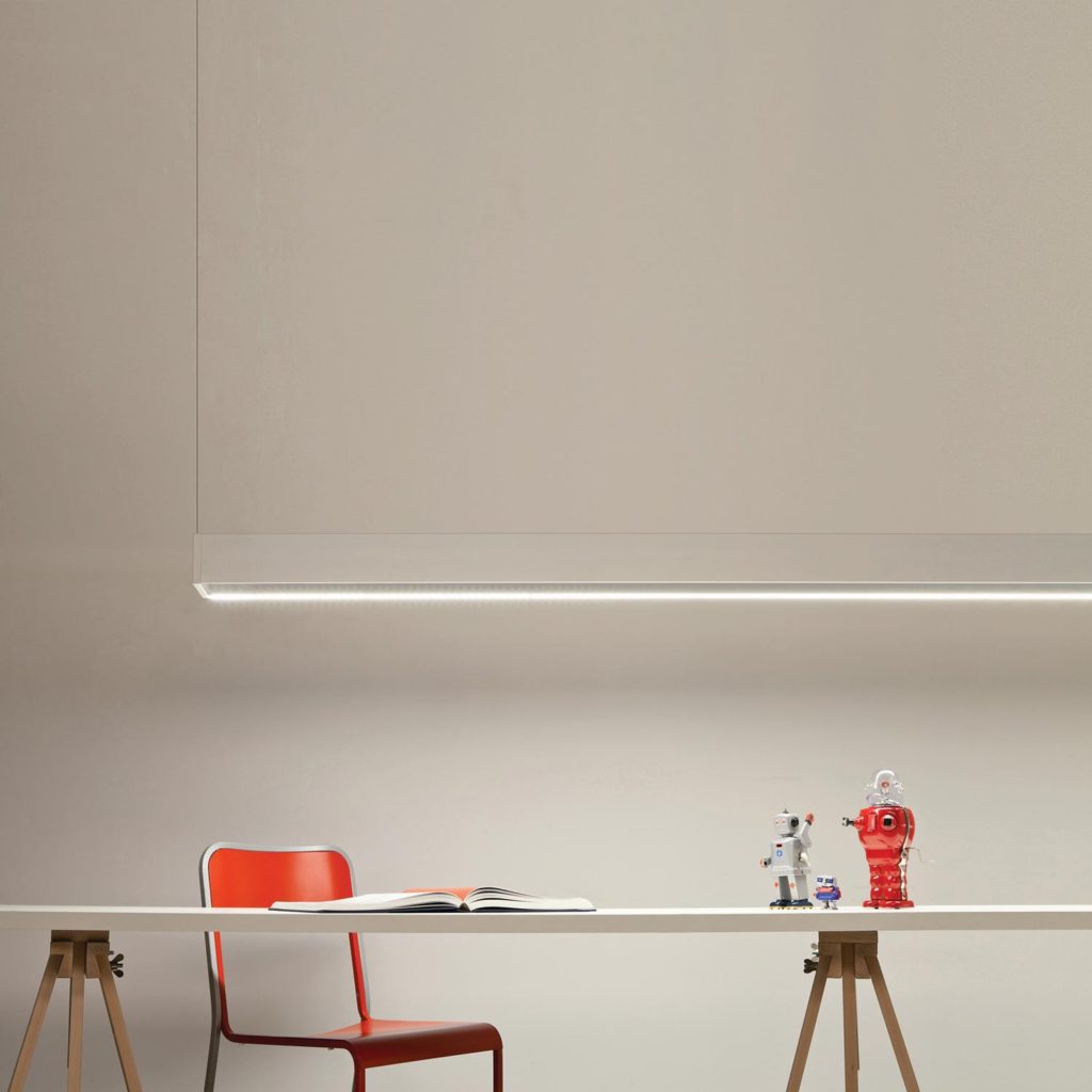 Horizontal and vertical pendant lamp with double linear LED source. Body in extruded aluminium. Heads in injection molded blended polymeric material, with diffusers in opal metacrylate. Structure painted in matt white, matt black and titan grey. Horizontal version available with uplight and downlight flood, or total up and total down. Dimmable.