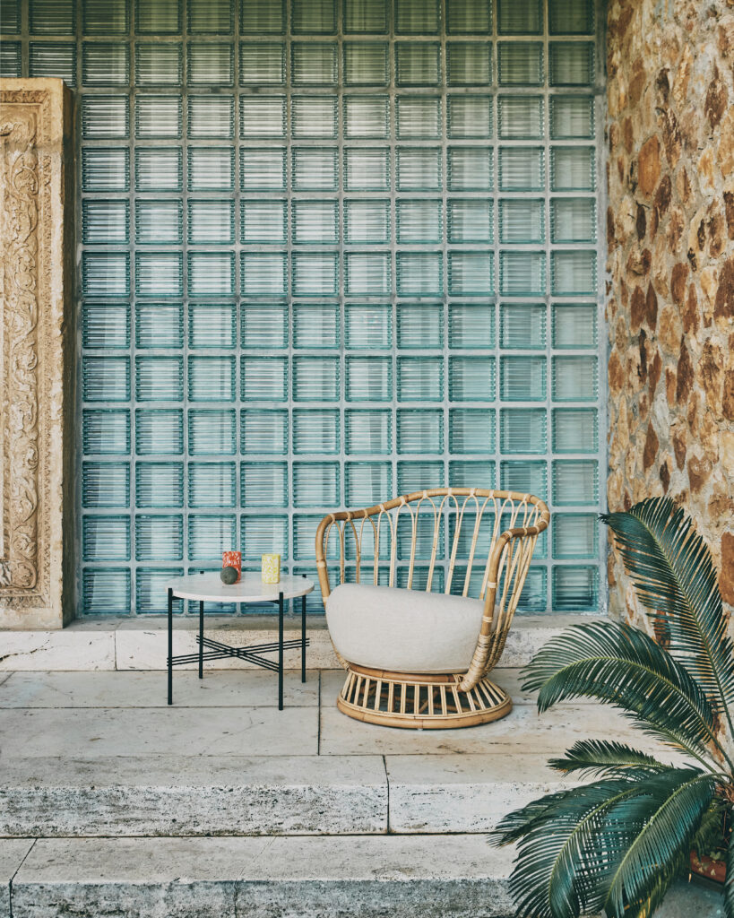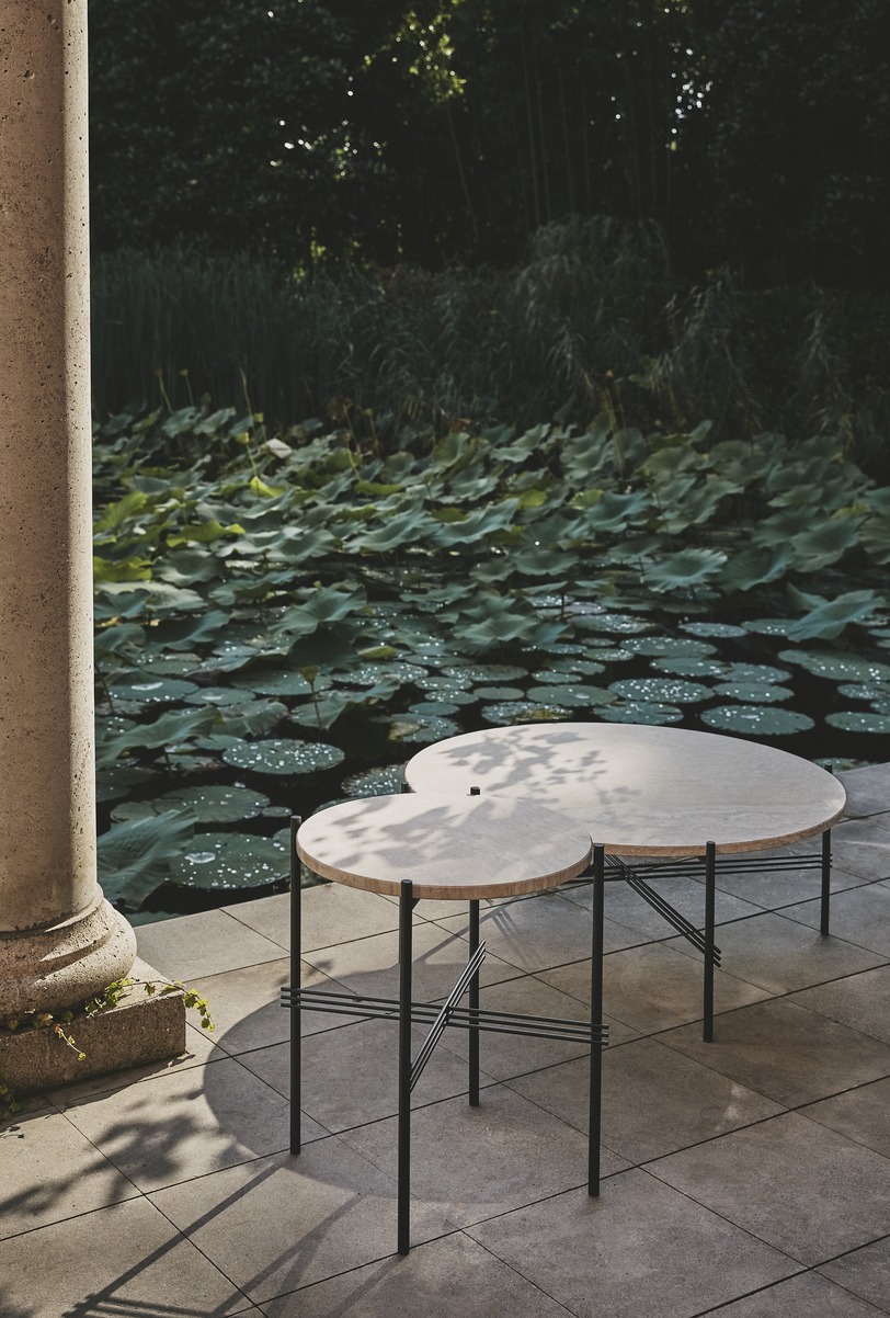 The TS Outdoor coffee table by GUBI combines a sleek metal base with a round travertine top, whose unique veins and colours make each table a one-of-a-kind oeuvre. Suitable for both indoor and outdoor use, the table makes a great companion for a lounge furniture set whether in a living room or out on the patio or in the garden.