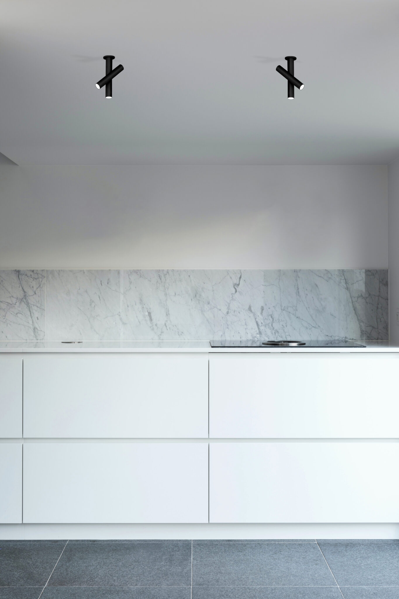 The latest addition to the TUBES collection, composed of tubular elements in extruded aluminum. A more compact and powerful ceiling version, with two vertical tubes, one fixed to the ceiling and one rotatable like an arm and adjustable to user needs. Both cylinders have a 340° rotation. Available in white and black. Opal polycarbonate diffusers.