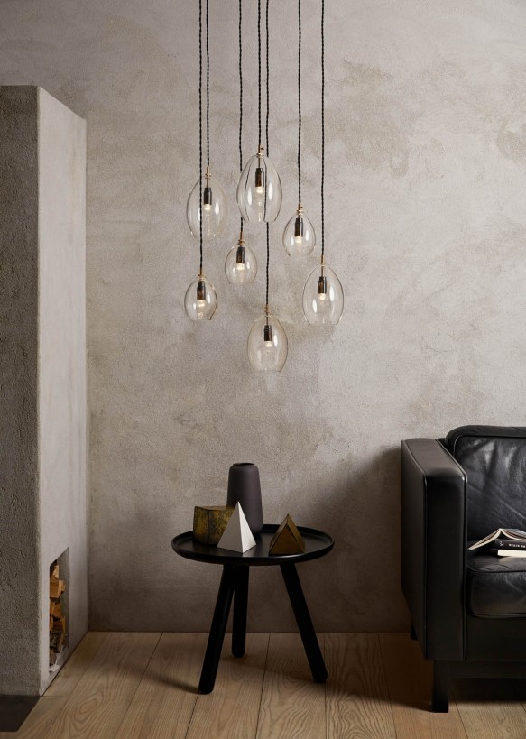 Unika is a mouth blown series of small, glass pendant lamps, originally designed for the Restaurant Grønbech and Churchill in Copenhagen. Its simple base is made of solid brass; a detail that gives the lamp a clean, industrial look, making a sharp contrast to the fragile, handmade glass lamp shade. The shade is available in two sizes: 135 mm and 200 mm (height), and hangs from a twisted fabric wire.