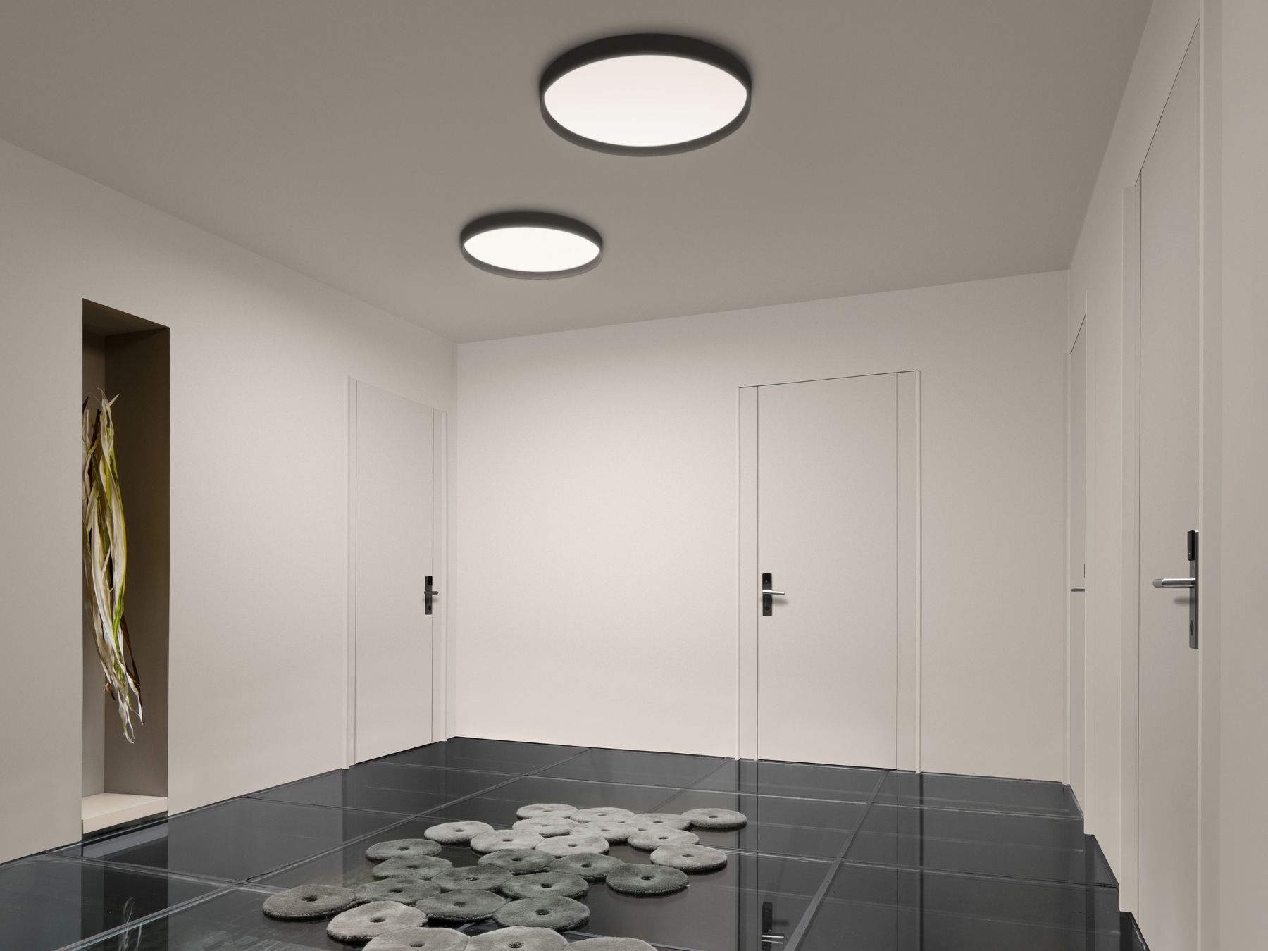 Up lamps are designed by Ramos & Bassols for Vibia. The Up ceiling lamps bring together compelling design and LED technology with the aim of creating a refined and unique collection. This exploitation of lighting technology means that the installation can be surface mounted. Each of the four models that constitute the Up collection becomes part of the ceiling, bringing a sophisticated aesthetic that blends with its surroundings. Vibia manufactures these ceiling lights in two colors: matt lacquered graphite and matt lacquered white.